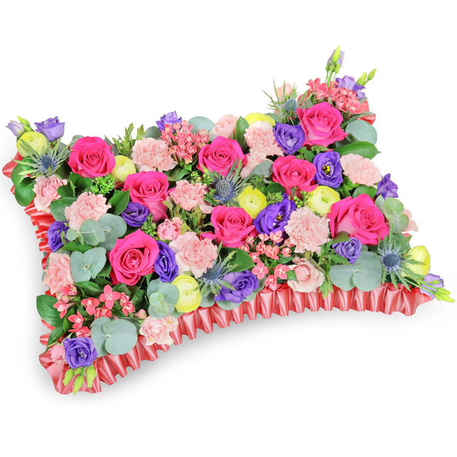 Discover the elegance and uniqueness of our pillow-shaped flower arrangement. This exquisite bouquet features a delightful blend of roses, carnations, ranunculus, lisianthus, and bouvardia, enhanced with fresh eucalyptus leaves and ruscus for added texture.